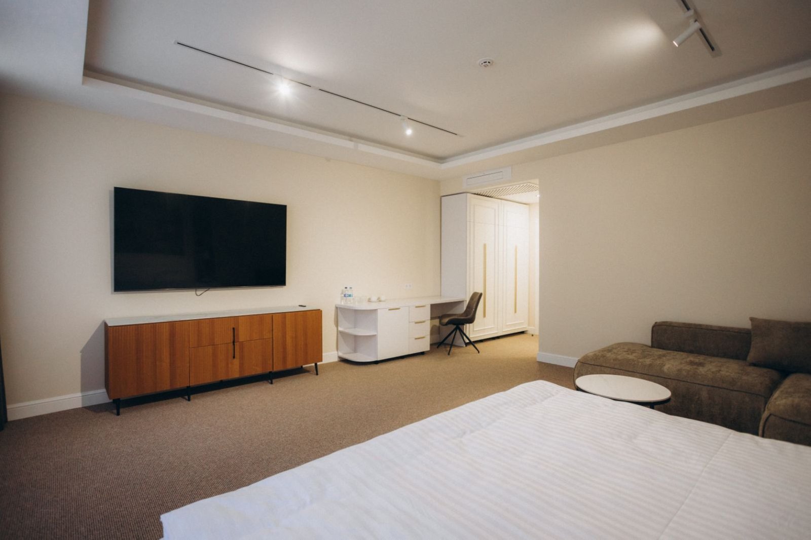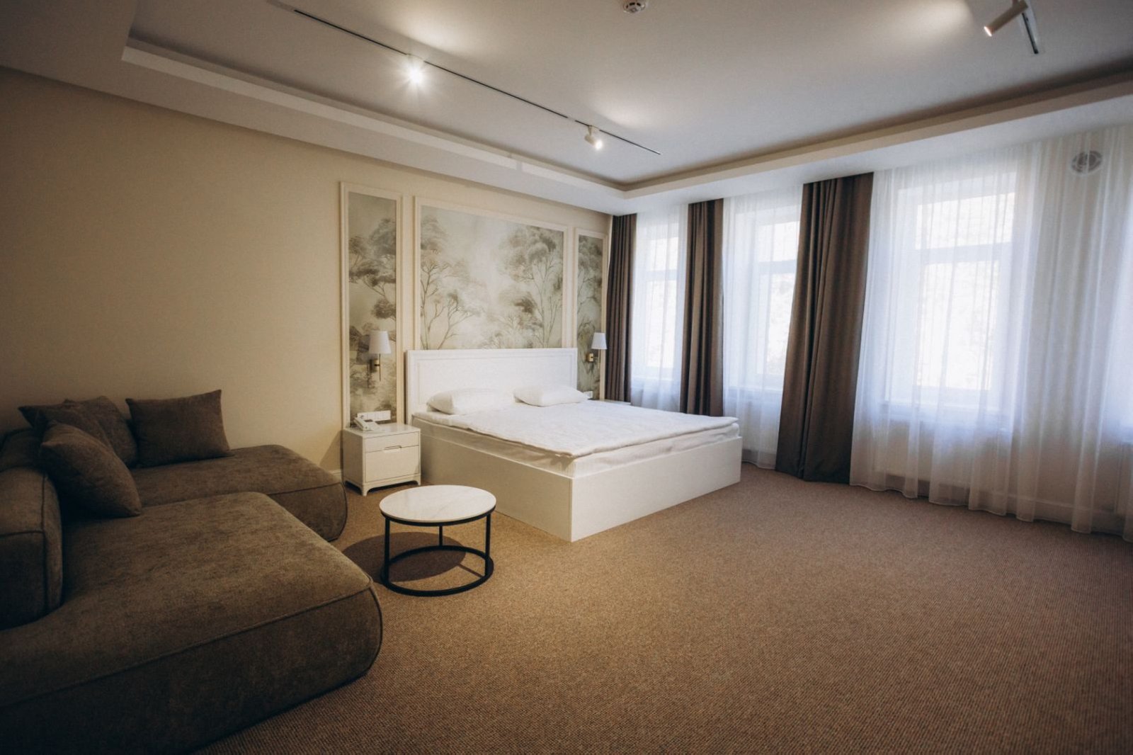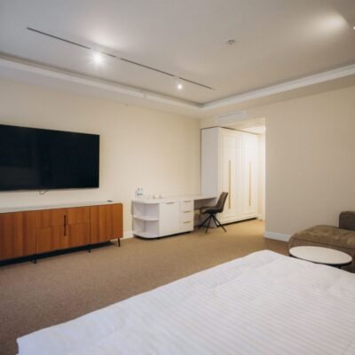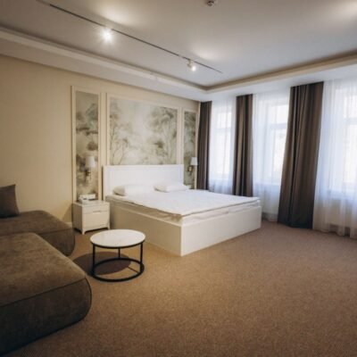 Netflix і електрочайником — усе для максимального комфорту. У ванній кімнаті до послуг гостей — душ, набір якісних косметичних засобів, рушники, фен, халати та капці. Люкс Весільний — розкішний однокімнатний номер категорії «Люкс весільний» створений для особливих моментів — медового місяця, річниці чи романтичної подорожі. Номер виконаний у вишуканому стилі з м’яким освітленням,